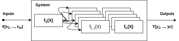 I usually distinguish a process from a system by considering the latter as composed of many processes. In the diagram below, we can find a more complex version of our basic process. In this case, the single input x is replaced by the set X of m inputs. We may also have more than an output, now represented by the set Y of n outputs. In turn, our system is represented by the set F of c functions or operations.