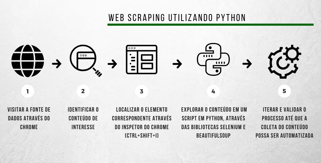O passo seguinte (4) é acessar estes dados a partir de linhas de código em Python, o que pode ser feito através de cadernos do Jupyter, scripts, ou através de uma IDE. Em qualquer dos casos, a ideia é emular o acesso ao portal desejado e a interação com a página web, utilizando para isso a biblioteca Selenium.