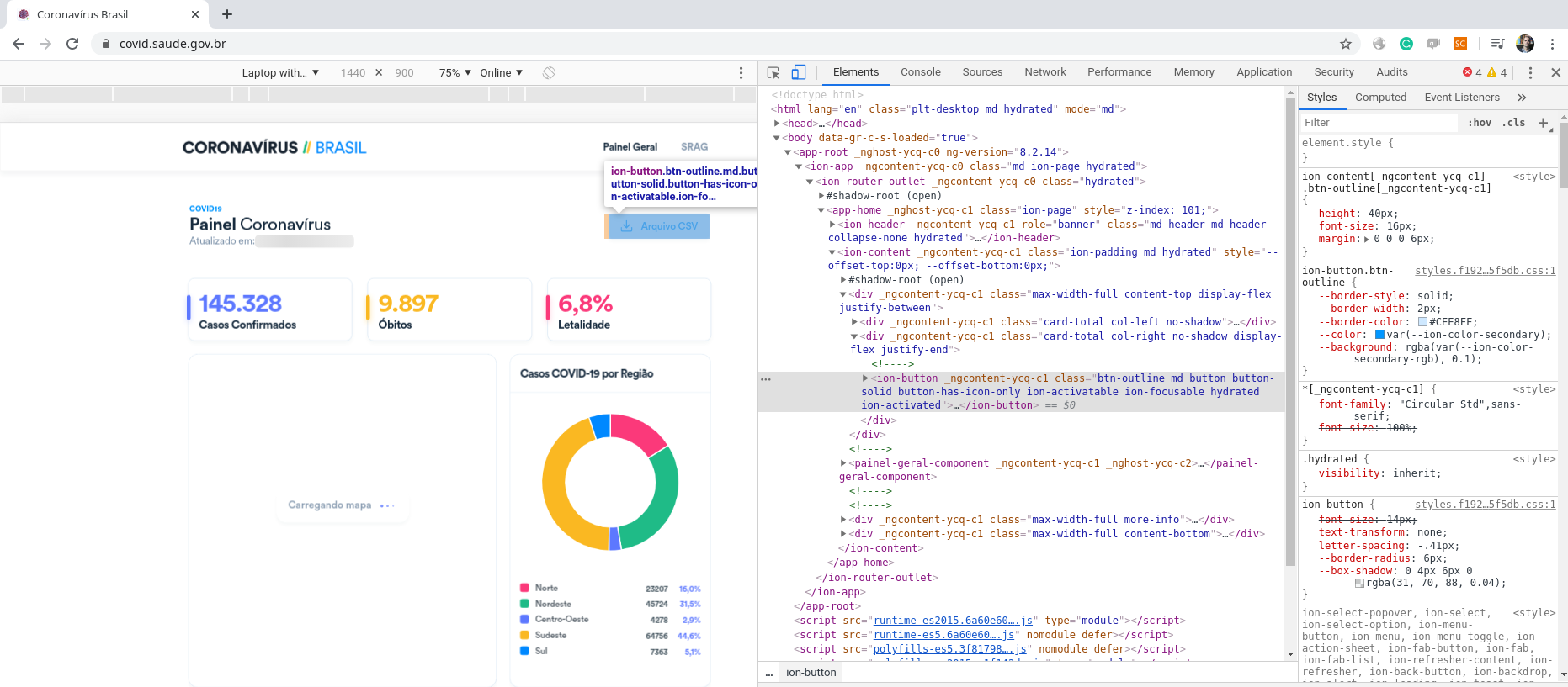 Chegamos finalmente à parte prática — e talvez a mais esperada — deste texto. Seguindo as etapas definidas na Fig. 4, começamos por (1) visitar o Painel Coronavírus Brasil e (2) identificar que o nosso interesse está nos dados disponibilizados ao clicarmos no botão “Arquivo CSV”, no canto superior direito da página. Ao ativarmos a ferramenta de inspeção de páginas do Google Chrome (3), localizamos o código correspondente ao item na página HTML, conforme mostrado na Fig. 5. Lembrando que a ferramenta de inspeção é ativada pelo menu Inspecionar, ao clicarmos com o botão direito sobre algum elemento da página, ou pelo atalho ctrl+shift+I.